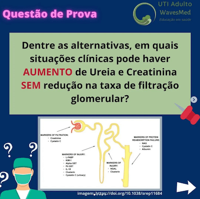 📌 A questão do post aborda um caso de “pseudo-renal failure”. Incremento na ingestão de aminoácidos, hipercatabolismo e uso de corticoides podem contribuir para aumento de uréia, sem que a tava de filtração tenha sido alterada. Uso de cimetidina pode aumentar a creatinina. Obstrução ureteral e doença tubulointersticial aumentam ureia e creatinina porém com redução da taxa de filtração.